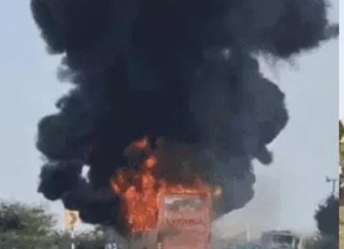 ಬೆಂಕಿಯಲ್ಲಿ ಧಗಧಗಿಸುತ್ತಿರುವ ಬಸ್ನ ವಿಡಿಯೋ ಸಾಮಾಜಿಕ ಮಾಧ್ಯಮಗಳಲ್ಲಿ ವೈರಲ್ ಆಗಿದ್ದು, ಜನರಲ್ಲಿ ಆತಂಕ ಮೂಡಿಸಿದೆ.