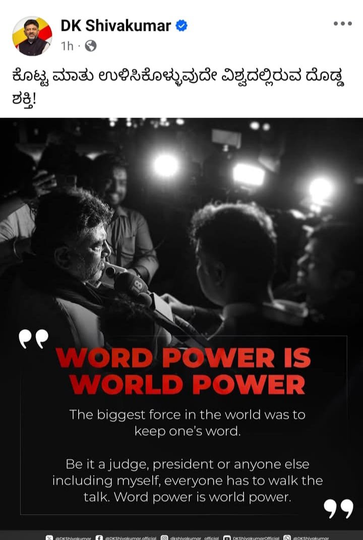 ಇದೀಗ ಡಿಕೆಶಿ ಮಾಡಿರುವ ಪೋಸ್ಟ್ ಒಂದು ಸಾಮಾಜಿಕ ಜಾಲತಾಣಗಳಲ್ಲಿ ಚರ್ಚೆ ಹುಟ್ಟುಹಾಕಿದೆ. ʻಕೊಟ್ಟ ಮಾತು ಉಳಿಸಿಕೊಳ್ಳುವುದು ವಿಶ್ವದಲ್ಲಿ ದೊಡ್ಡ ಶಕ್ತಿʼ ಎಂಬ ಡಿಸಿಎಂ ಡಿಕೆ ಶಿವಕುಮಾರ್ ಪೋಸ್ಟ್ ಸಿಎಂ ಸಿದ್ದರಾಮಯ್ಯ ಅವರಿಗೆ ಪರೋಕ್ಷವಾಗಿ ಟಾಂಟ್ ಕೊಟ್ಟಂತಿದೆ.