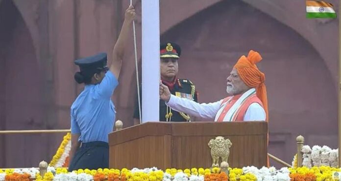 ನವದೆಹಲಿ:- ದೆಹಲಿಯ ಕೆಂಪಕೋಟೆಯಲ್ಲಿ ಭಾರತದ ಪ್ರಧಾನಿ ನರೇಂದ್ರ ಮೋದಿ ಅವರು ಧ್ವಜಾರೋಹಣ ನೆರವೇರಿಸಿದರು.