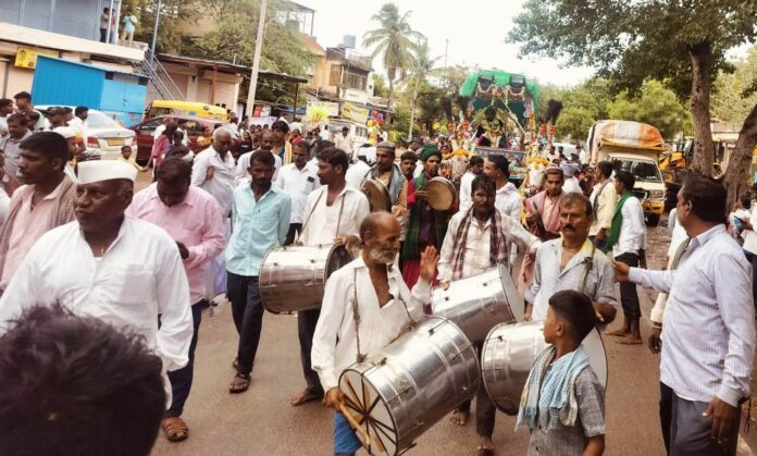 ವಾದ್ಯ ವೃಂದಗಳ ನಡುವೆ ಲಕ್ಷ್ಮೀ ದೇವಿಯನ್ನು ತಂದ ಭಕ್ತರು