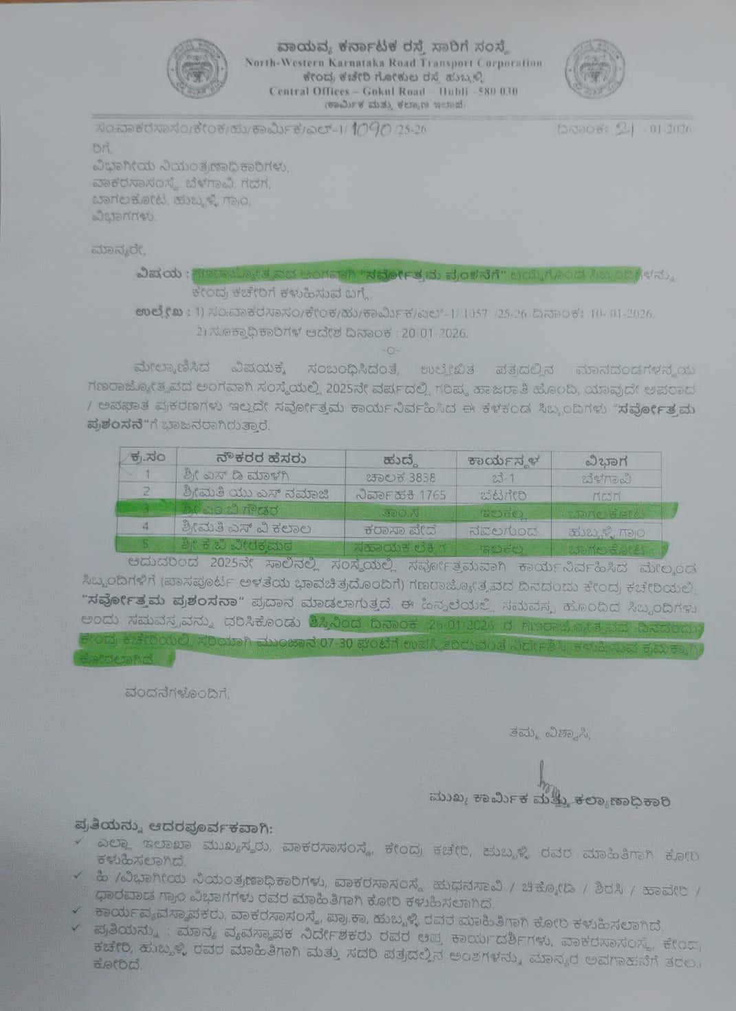ಇಲಕಲ್ಲ: ವಾಯುವ್ಯ ಕರ್ನಾಟಕ ರಸ್ತೆ ಸಾರಿಗೆ ಸಂಸ್ಥೆ (NWKRTC)ಯ ಇಲಕಲ್ಲ ಡೀಪೋದಲ್ಲಿ ಕಾರ್ಯನಿರ್ವಹಿಸುತ್ತಿರುವ ಸಹಾಯಕ ಲೆಕ್ಕಿಗ ಶ್ರೀ ಕುಮಾರಸ್ವಾಮಿ ವಿರಕ್ತಮಠ ಅವರು 2025–26ನೇ ಸಾಲಿನ ಸರ್ವೋತ್ತಮ ಪ್ರಶಂಸನಾ ಗೌರವಕ್ಕೆ ಭಾಜನರಾಗಿದ್ದಾರೆ.2025ನೇ ಸಾಲಿನಲ್ಲಿ ಗರಿಷ್ಠ ಹಾಜರಾತಿ ಹಾಗೂ ಯಾವುದೇ ಅಪರಾಧ ದಾಖಲೆಗಳಿಲ್ಲದೇ ಶಿಸ್ತುಬದ್ಧವಾಗಿ ಕಾರ್ಯನಿರ್ವಹಿಸಿದ್ದ ಹಿನ್ನೆಲೆ ಅವರನ್ನು ಈ ಗೌರವಕ್ಕೆ ಆಯ್ಕೆ ಮಾಡಲಾಗಿದೆ ಎಂದು ಮುಖ್ಯ ಕಾರ್ಮಿಕ ಮತ್ತು ಕಲ್ಯಾಣ ಅಧಿಕಾರಿ ತಿಳಿಸಿದ್ದಾರೆ. ಈ ಕುರಿತು ಬಾಗಲಕೋಟೆ ವಿಭಾಗೀಯ ನಿಯಂತ್ರಣ ಅಧಿಕಾರಿಗಳಿಗೆ ಪತ್ರದ ಮೂಲಕ ಮಾಹಿತಿ ನೀಡಲಾಗಿದೆ.
