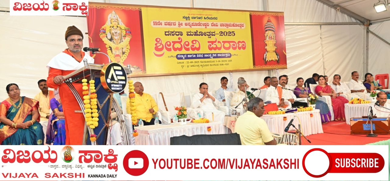 ನಗರದ ಮುಳಗುಂದನಾಕಾ ಬಳಿಯ ಶ್ರೀಅಡವೀಂದ್ರಸ್ವಾಮಿ ಮಠದಲ್ಲಿ ದಸರಾ ಮಹೋತ್ಸವ ಮತ್ತು ಶ್ರೀದೇವಿ ಪುರಾಣ ಪ್ರವಚನ ಕಾರ್ಯಕ್ರಮದ ಸಾನ್ನಿಧ್ಯ ವಹಿಸಿ ಅವರು ಮಾತನಾಡಿದರು.