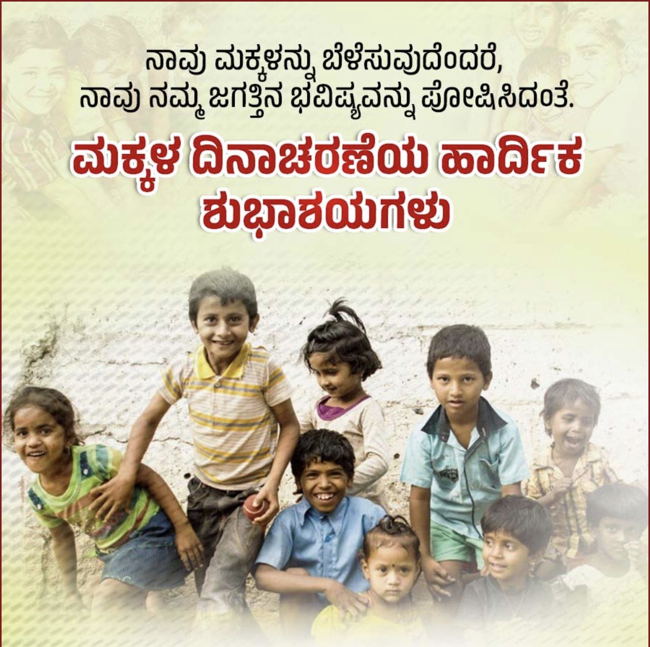 ರಾಷ್ಟ್ರವನ್ನು ಕಟ್ಟಲಾಗುತ್ತಿರುವ ಒಂದು ಮನೆಯೆಂದು ಪರಿಗಣಿಸುವುದಾದರೆ ಮಕ್ಕಳು ಆ ಮನೆ ನಿರ್ಮಾಣದ ಇಟ್ಟಿಗೆಗಳಂತೆ. ನಾವೆಷ್ಟು ಉತ್ತಮವಾದ ಇಟ್ಟಿಗೆಯನ್ನು ಮನೆಯ ನಿರ್ಮಾಣಕ್ಕಾಗಿ ಸಜ್ಜುಗೊಳಿಸುತ್ತೇವೆಯೋ ಅಷ್ಟು ಸುಂದರವಾದ ಮನೆ ನಿರ್ಮಾಣವಾಗುತ್ತದೆ. ದೇಶದ ಸಂಸ್ಕೃತಿ, ಕಲೆ, ಸಾಹಿತ್ಯ, ಸಂಪ್ರದಾಯ ಎಲ್ಲವೂ ಉಳಿದು ಬೆಳೆದು ಸಾಗಬೇಕು ಎಂದಾದರೆ ಪ್ರತಿಯೊಬ್ಬ ಹಿರಿಯರೊಳಗಿರುವ ಮಗುವೂ ಜೀವಂತವಾಗಿರಬೇಕು ಮತ್ತು ಪ್ರತಿ ಮಗುವಿಗೂ ಅತ್ಯುತ್ತಮ ಪೋಷಣೆಯ ಅಡಿಪಾಯ ದೊರೆಯಬೇಕು.