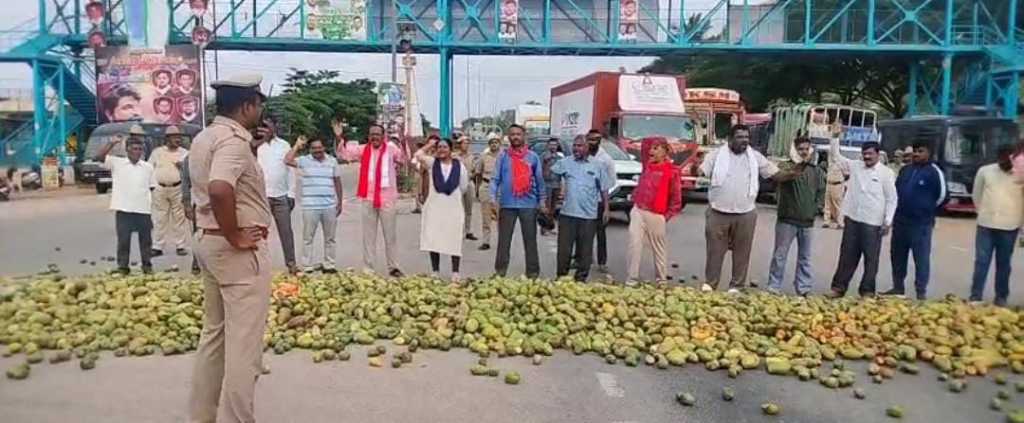 ನಗರದ ಹೊರ ವಲಯದ ಕೊಂಡರಾಜನಹಳ್ಳಿ ಬಳಿ ಬೆಂಗಳೂರು-ಚೆನೈ ರಾಷ್ಟ್ರೀಯ ಹೆದ್ದಾರಿ ತಡೆದು, ಮಾವಿನ ಹಣ್ಣನ್ನು ರಸ್ತೆಯಲ್ಲಿ ಸುರಿದು ರೈತರು ಆಕ್ರೋಶ ವ್ಯಕ್ತಪಡಿಸಿದ್ದಾರೆ. ಕೇಂದ್ರ ಹಾಗೂ ರಾಜ್ಯ ಸರ್ಕಾರಗಳು ಬೆಂಬಲ ಬೆಲೆ ನೀಡದ ಹಿನ್ನೆಲೆ, ಕಳೆದ 22 ದಿನಗಳಿಂದ ರೈತರು ಪ್ರತಿಭಟನೆ ನಡೆಸುತ್ತಿದ್ದರು. ಬಂದ್, ಹೋರಾಟ ಮಾಡಿದರೂ ಪ್ರಯೋಜನವಾಗಿಲ್ಲ. ಇದರಿಂದ ಹೆದ್ದಾರಿ ತಡೆದು ರೈತರು ಪ್ರತಿಭಟನೆ ಆರಂಭಿಸಿದ್ದಾರೆ.