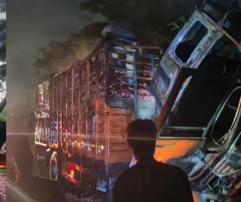 ಇಂಜಿನ್ʼನಲ್ಲಿ ಶಾರ್ಟ್ ಸರ್ಕ್ಯೂಟ್: ಈರುಳ್ಳಿ ತುಂಬಿದ್ದ ಲಾರಿ ಬೆಂಕಿಗಾಹುತಿ
